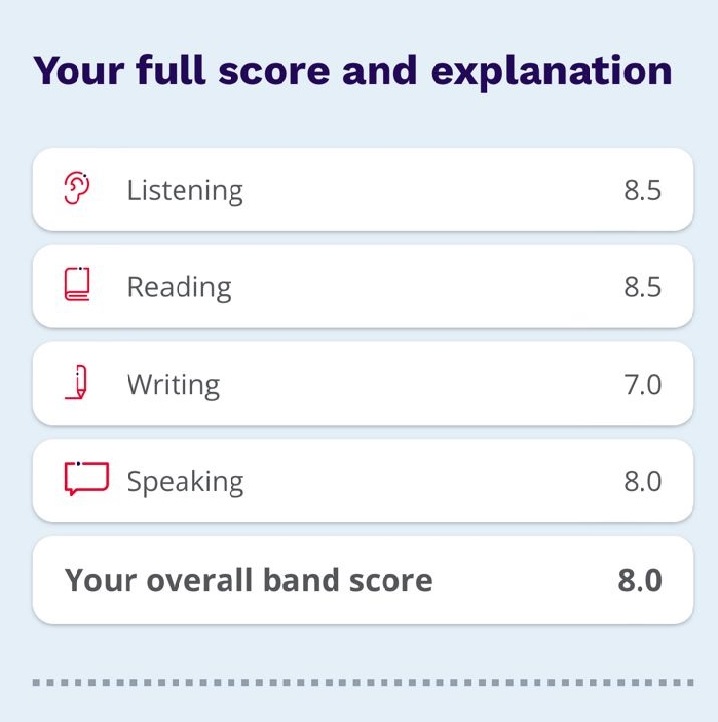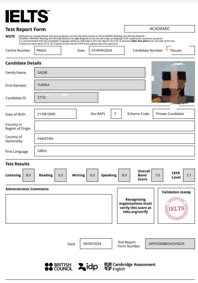 I scored a 7 which was my required band score. Thank You Miss Nadia for your guidance. It really helped me a lot. I highly recommend all of the new students who are looking for online classes for IELTS.