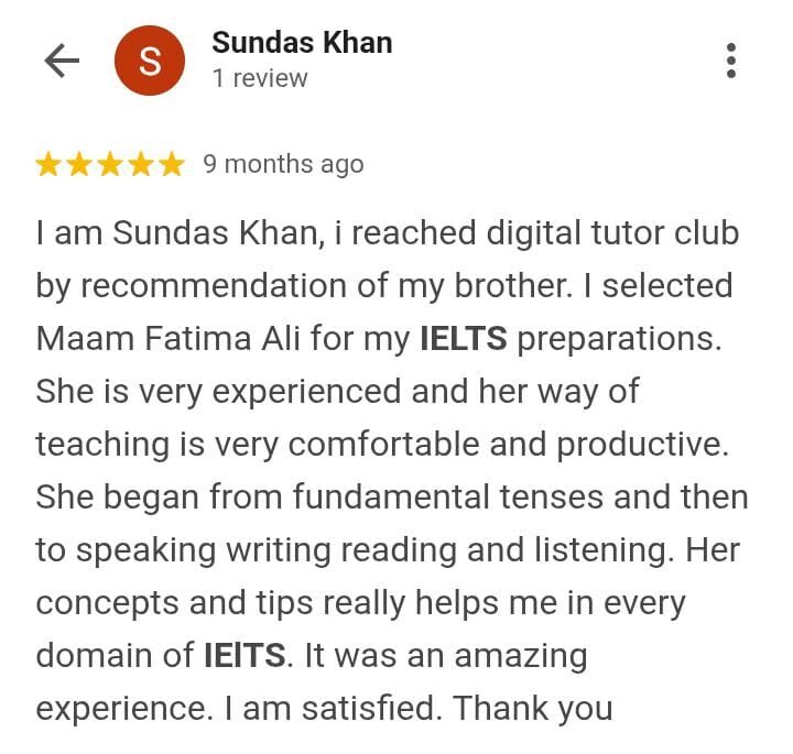 Hii sahar here. I have done my IELTS preparation through digital tutor club that’s a amazing website. I did my preparation under the kind supervision of mam Nadia Khan. She is very nice teacher. She is cooperative and her methodology is understandable. The thing that I differently found here is the cooperation with students. And I really appreciate this.