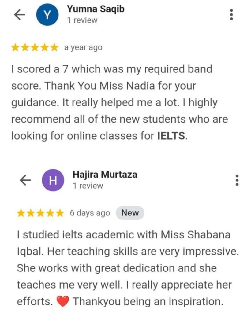 My name is Rabia shahzadi. I recently took the IELTS course from mam Nadia. She is very cooperative, conscientious and shows excellent effort and care with daily work. She truly cares about students’problems as she rescheduled my timetable a lot of time only on my saying .